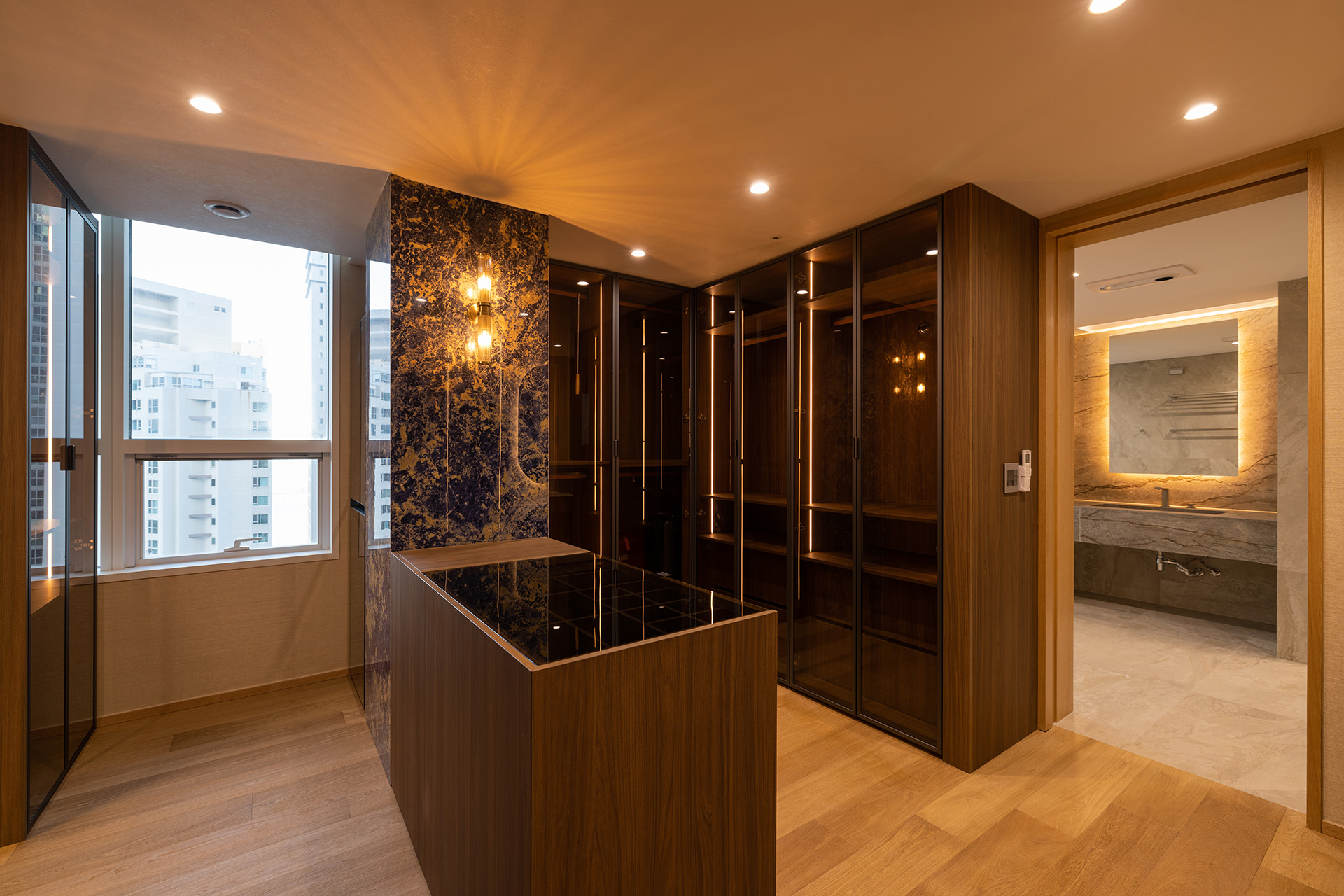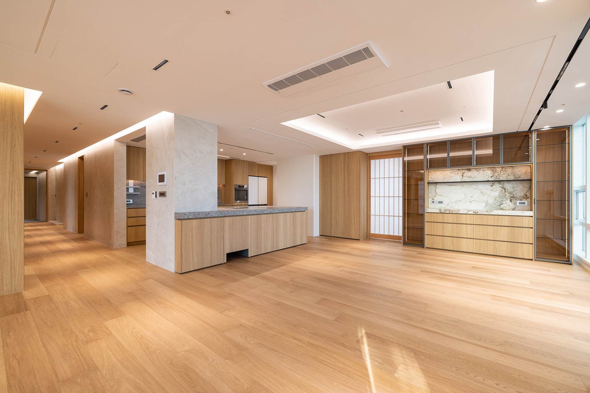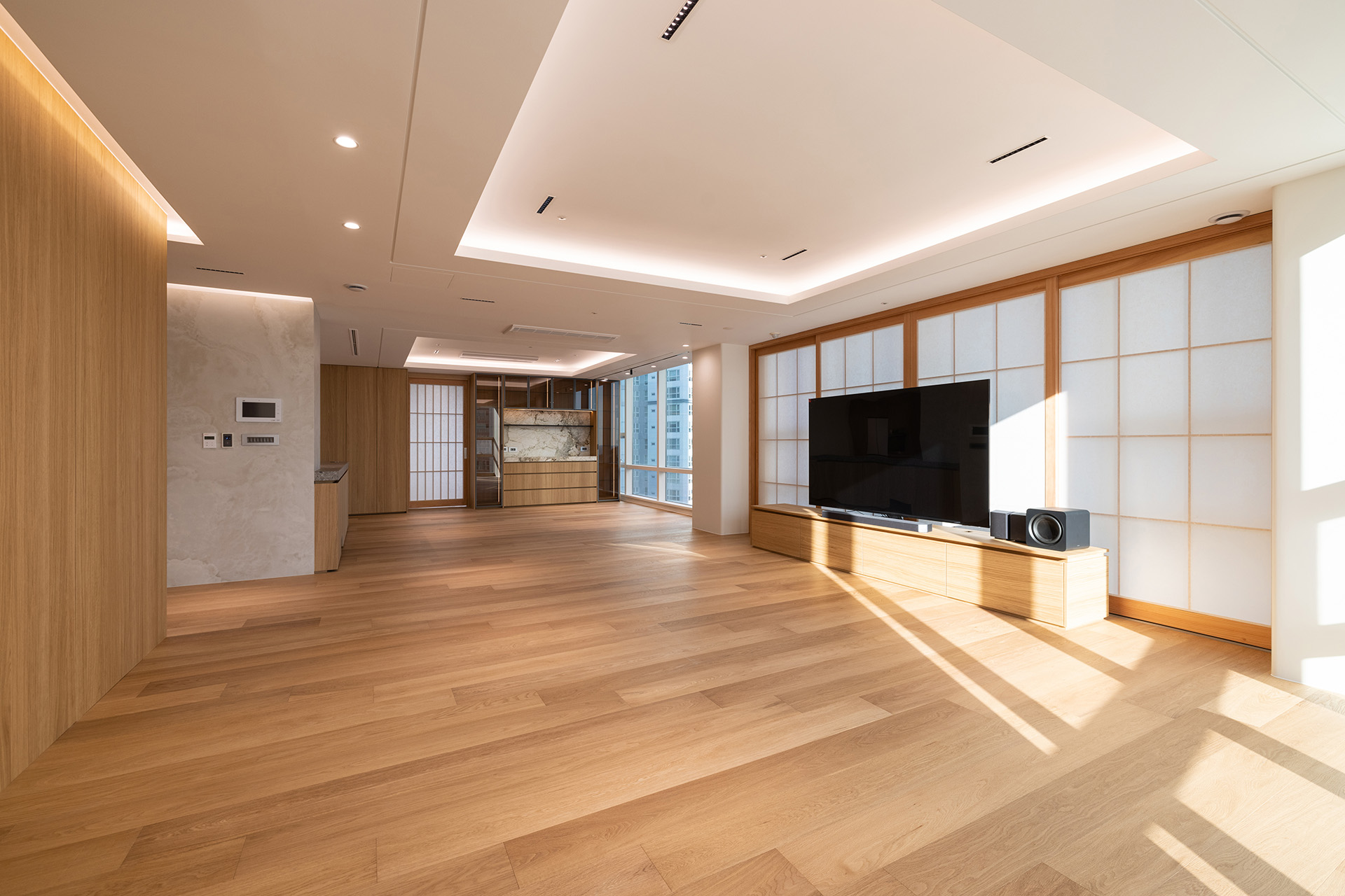 해운대 현대베네시티 상층부에 위치한 주거 공간으로, 거실–다이닝–주방에서 한눈에 펼쳐지는 바다 전망을 중심 축으로 계획했습니다. 동양적 미감을 담은 젠 스타일을 바탕으로, 따뜻한 우드 마감과 절제된 석재 표현을 조합해 고요하면서도 현대적인 분위기를 구현했습니다. 자연광과 야경이 실내 재료와 어우러지며, 휴식과 일상의 무게를 모두 담아낼 수 있는 레지던스 인테리어를 지향했습니다.