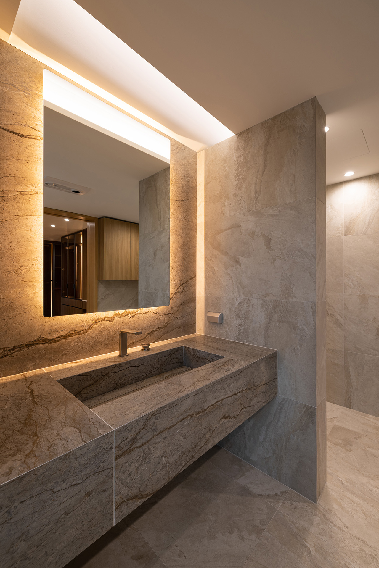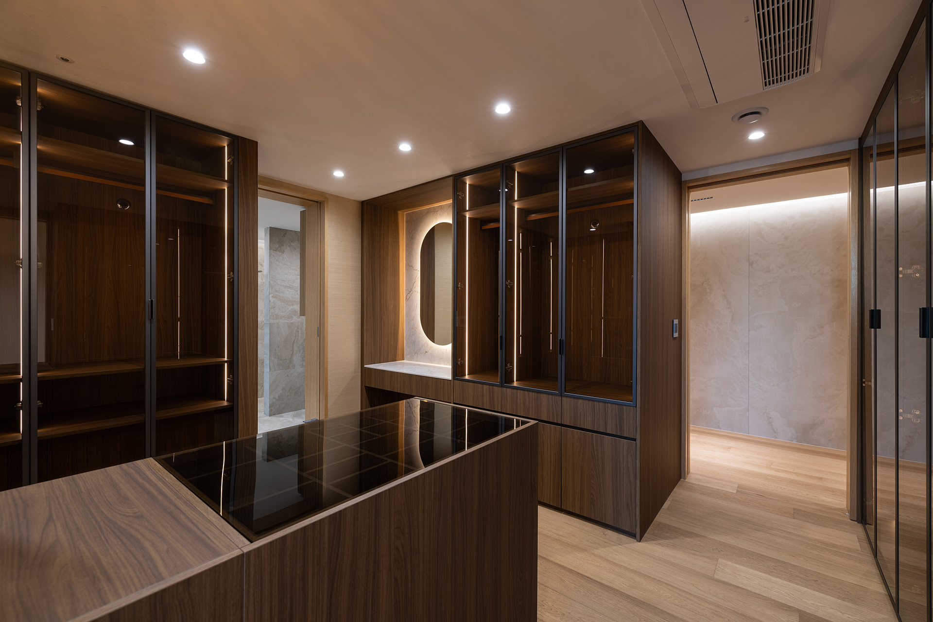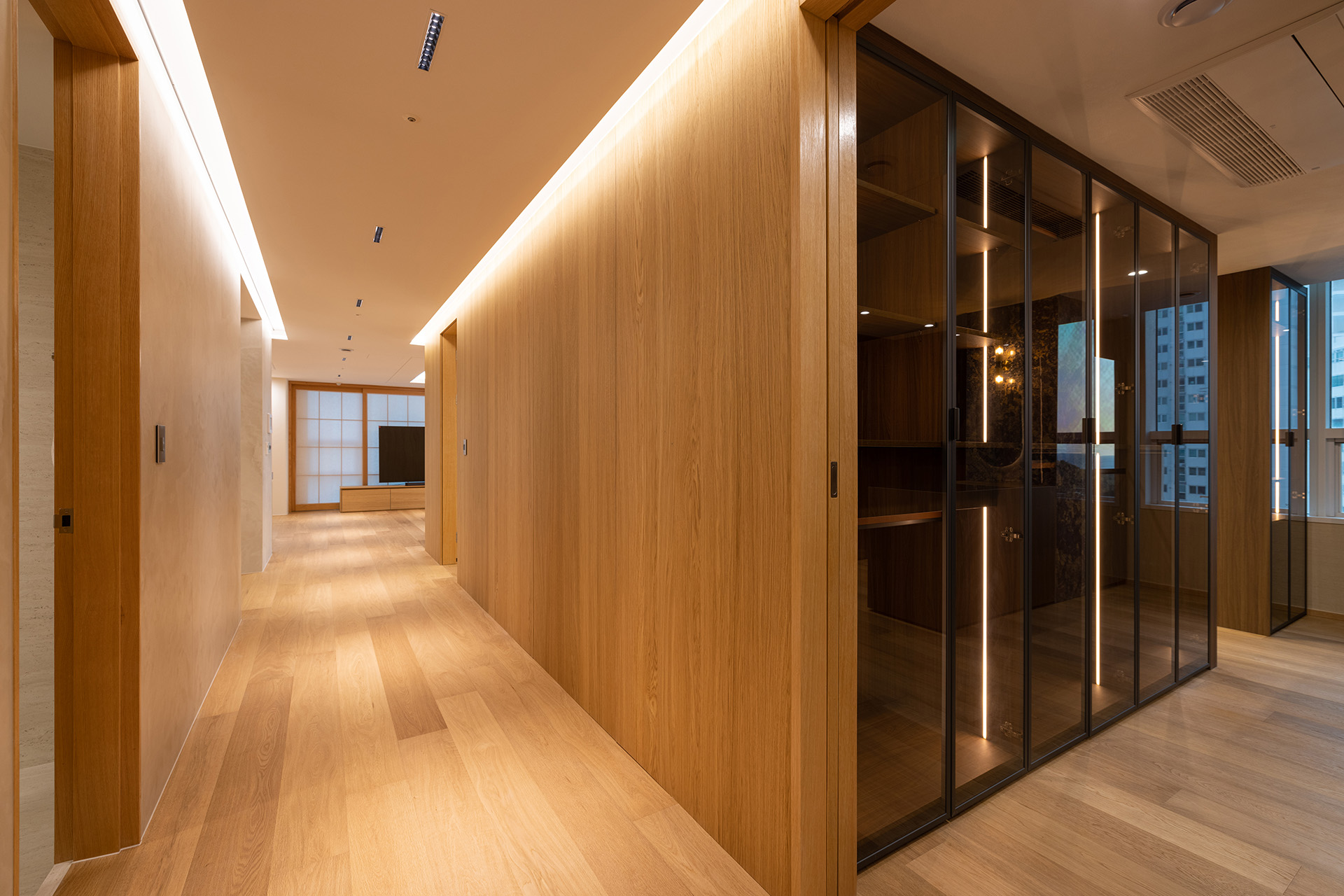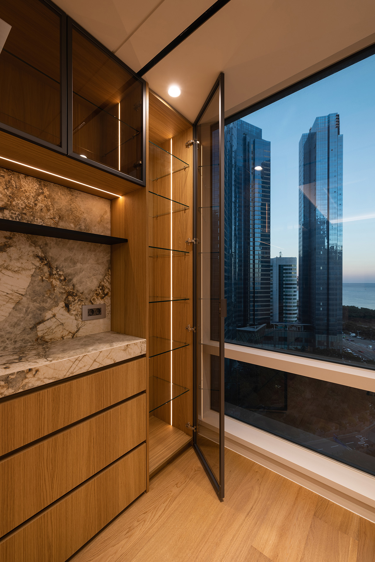 해운대 현대베네시티 상층부에 위치한 주거 공간으로, 거실–다이닝–주방에서 한눈에 펼쳐지는 바다 전망을 중심 축으로 계획했습니다. 동양적 미감을 담은 젠 스타일을 바탕으로, 따뜻한 우드 마감과 절제된 석재 표현을 조합해 고요하면서도 현대적인 분위기를 구현했습니다. 자연광과 야경이 실내 재료와 어우러지며, 휴식과 일상의 무게를 모두 담아낼 수 있는 레지던스 인테리어를 지향했습니다.