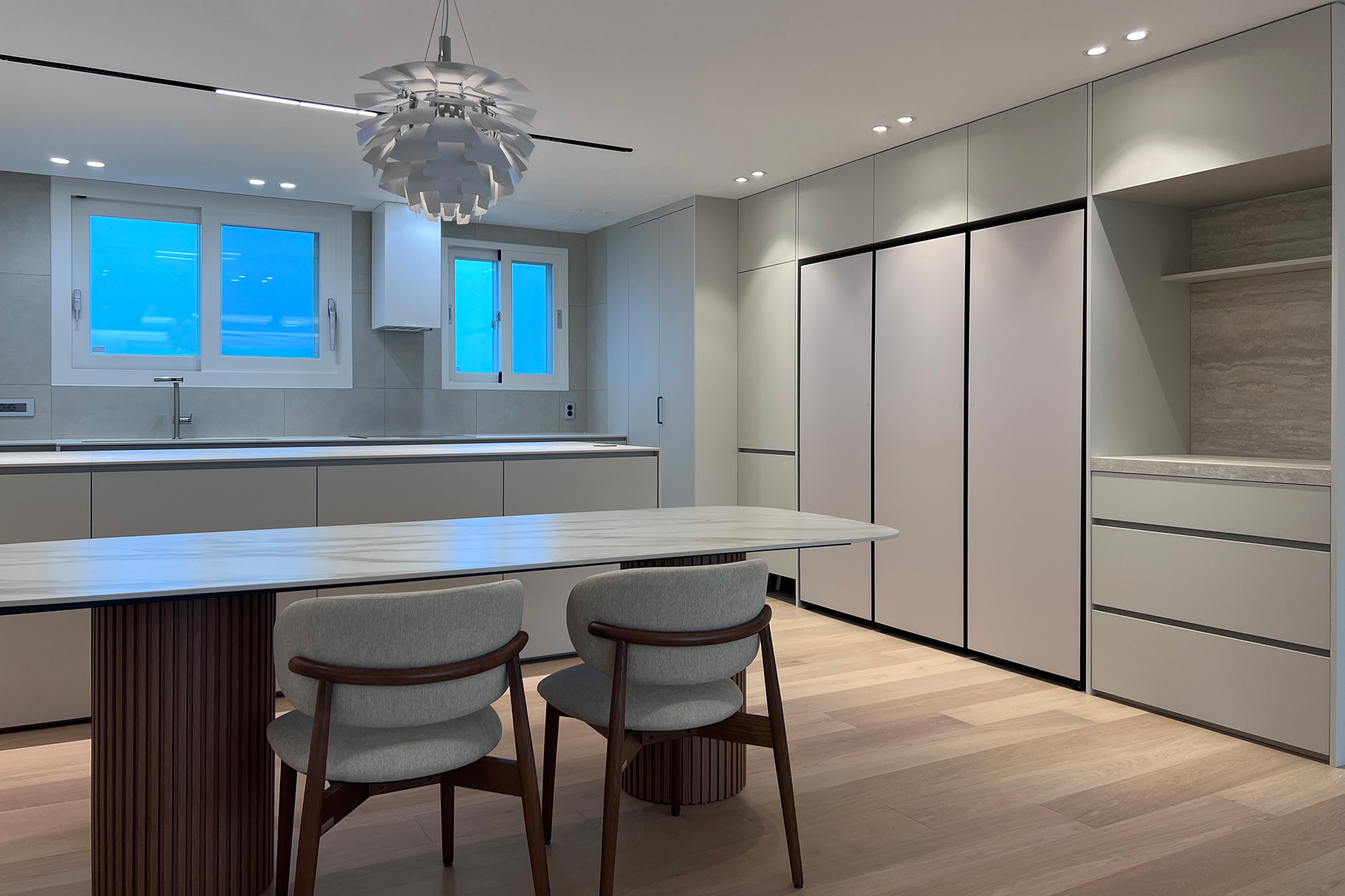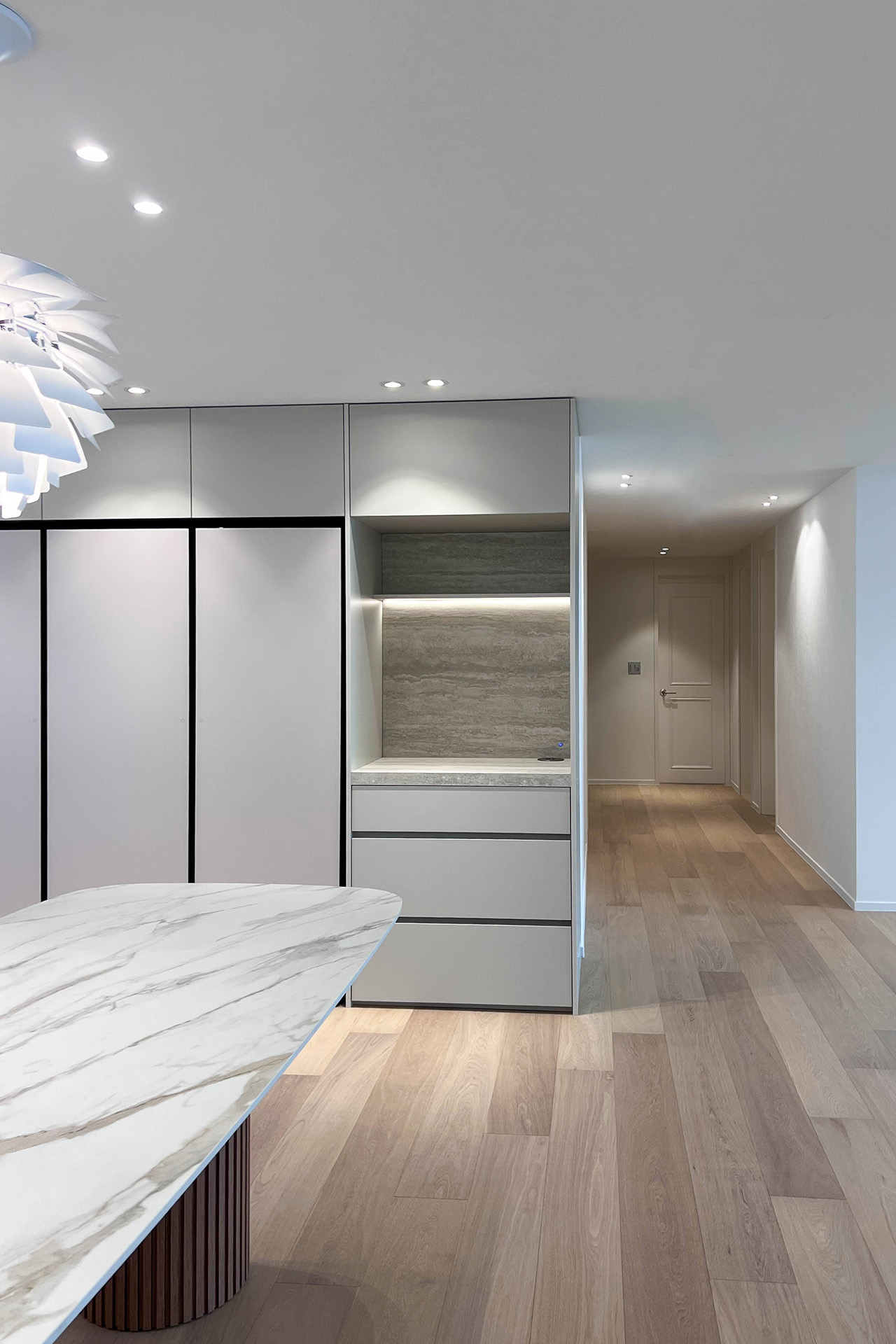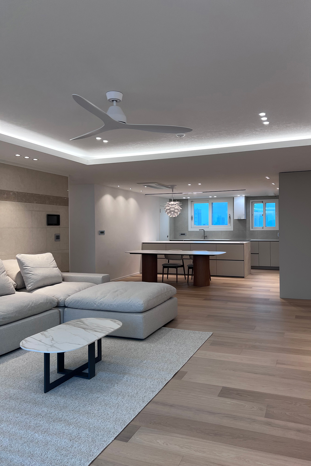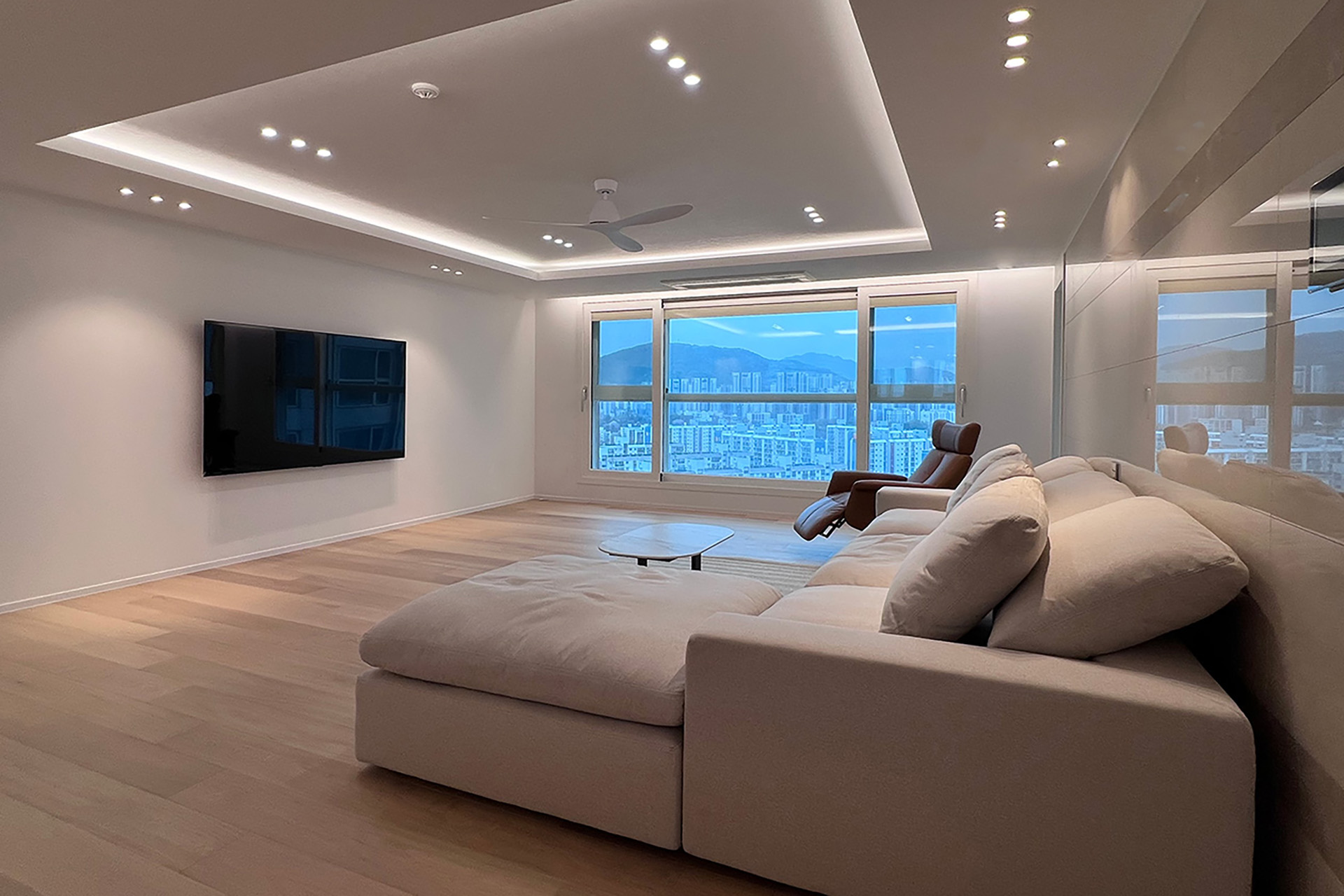 대치동 래미안 아파트 리모델링 프로젝트로, 거실과 다이닝, 주방을 시선이 막히지 않는 하나의 리빙 존으로 구성했습니다. 특히 주방의 아일랜드를 새롭게 배치해 음식을 준비하는 사람과 가족이 서로를 마주보며 식사와 대화를 나눌 수 있도록 계획했고, 따뜻한 우드 바닥과 미니멀한 화이트 가구, 간접 조명을 더해 차분하면서도 밝은 일상 공간을 만들었습니다.