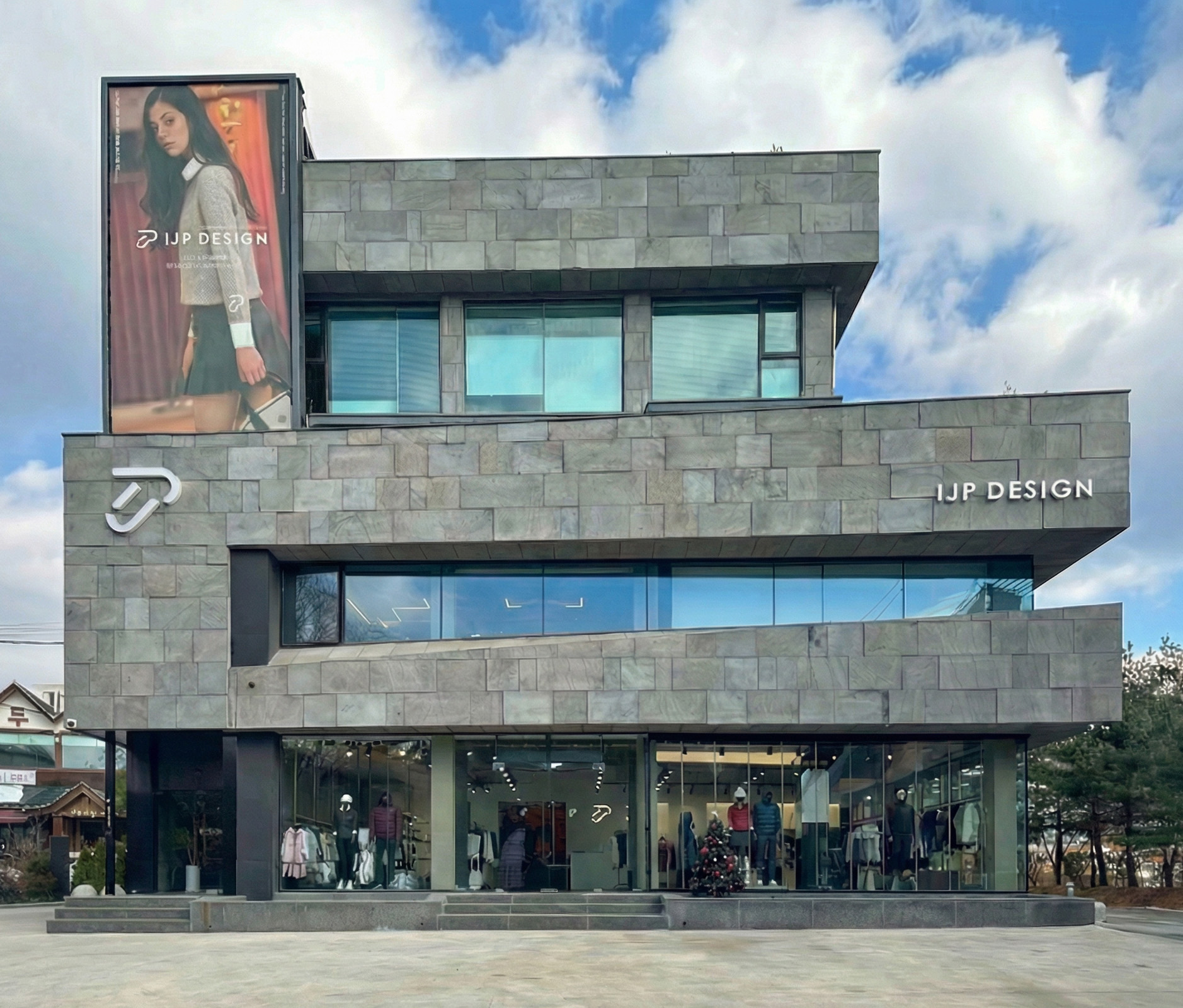그레이 스톤 매스와 투명 쇼윈도로 완성한 패션 플래그십 스토어입니다.